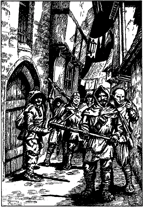 商人ギルドは何階もある石造りの立派な建物で、広場に面した正面玄関は、遠く南、骸骨砂漠から運ばれてきた木材で造られていると言われている。ドアは閉じられていて、警備兵がその側に立っているのが見て取れる。こっちは警備兵に気づいたものの、警備兵はこっちに気づいていないようだ。だが、これ以上近づくのは危険と見えるな。他の入口を捜してみよう。商人ギルドの脇に小道がある。ここを進んでみよう。しばらくして道は鋭角に右に曲がり、更にそこから少し行った左側にもう一つ別のもっと細い道があった。その道はすぐに行き止まりになっていたが、その左側にドアと排水管がある。排水管は窓から屋根にのぼっているから、ここから商人ギルドへ入れそうだ。この小道へ入ることも考えたが、まずは商人ギルドの周りを進んでみよう。建物の周りに沿って進むと、右手に更に細い路地が見えた。そしてその路地には、四人の人影がいる。その四人は私の行く手を阻むようだった。私は慌てて後ろを振り向く。すると、まるで私の退路を断つかのように、更に三人の人影が立ち塞がっていた。