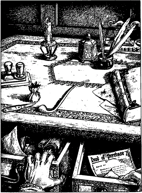 引き出しの中にはLという文字が刻まれている鍵、金貨10枚、書類と手紙があった。鍵と金貨は抜かりなく懐にしまい、書類と手紙に目を通す。書類には、ブラスが最近バロウの丘というところに土地を買ったことが記されていた。一種の権利書みたいなものか。手紙の差出人はバルバンティスという魔法使いだった。“バロウの丘の地所はご指示の通りにいたしました。キーNo.は90です。”どうやら、この2通の文書は重要なヒントらしい。さて、準備も整ったことだし、せっかくだから鉄のドアも調べてみることにする。案の定鍵がかかっていた。しかも、鉄だけあってドアは頑丈そのものだ。力づくで開けることはまず不可能だろう。おまけに鍵も、かなり大きくて複雑な代物である。手持ちの合鍵を全て試してみたが、どれも合わなかった。この鍵を開けるには“錠破り”の特殊技能そのものを持っていなくてはならず、合鍵の束では太刀打ちできない。(管理人注:訳書にはこの旨を明記していませんでしたが、今後技術点の判定を行う理由が“錠破り”による場合、合鍵の束は使えないものとします。この解釈について、ご感想・ご意見・ご批判などがございましたら、掲示板にてお知らせください。)