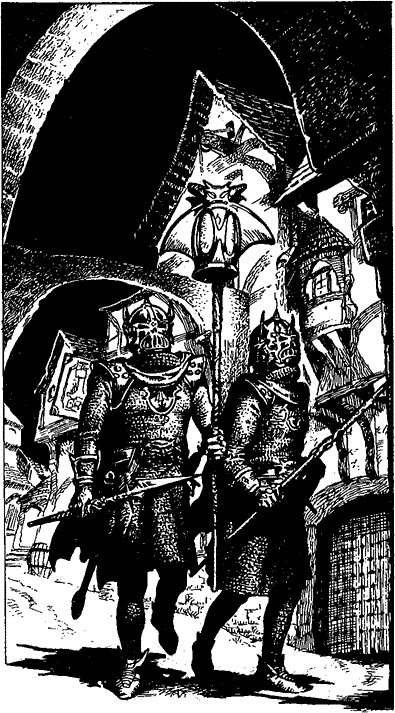 まずい、噂をすれば警備兵どもだ。どこかに隠れよう。“姿隠し”の特殊技能は持っていないが、どこかに隠れられれば……あった。私は近くの家の暗い玄関口に、音を立てないようにしながら身を隠した。明かりと足音はどんどんこちらに近づいてくる。目をつぶって、2人が私に気づかずに通り過ぎることを願った……
