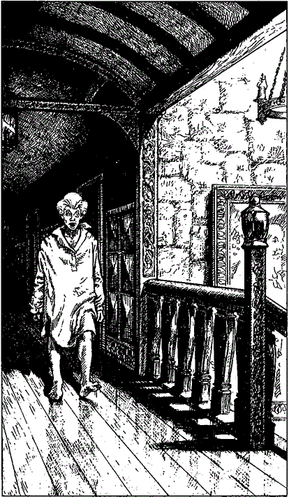 男は私を指差して、何やら支離滅裂なことを口走っている。男のローブが私の顔に触れたにも関わらず、男は“真の”存在には気づかないまま、再びもといた部屋に入って行った。危ないところだった。さっきの男は単に寝ぼけていただけだったのだ。もしあのとき、男を殴っていたら、男は叫び声を上げて家じゅうの人を起こしてしまったことだろう。慌てなかった私は、ジパングにいる姪に感謝した(運点+1)。しばらくじっとそこで待っていたが、誰も部屋から出てくる気配はない。私は再びバルコニーを進み始めた。