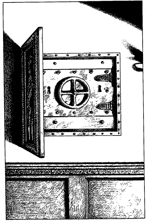 金庫は、肖像画の後ろの壁にピッタリと収まっていた。この金庫を破壊して中身を取り出すことは到底不可能に思えた。仮に破壊できたとしても、破壊するときの音で住人達が起き出してしまうから、どの道無理だ。金庫の真ん中にはハンドルがあり、その両側に2つの鍵穴があった。ここで、“L”の鍵の出番だ。“R”の鍵はブラスからすり取らなかったが、確か合鍵が……あった!